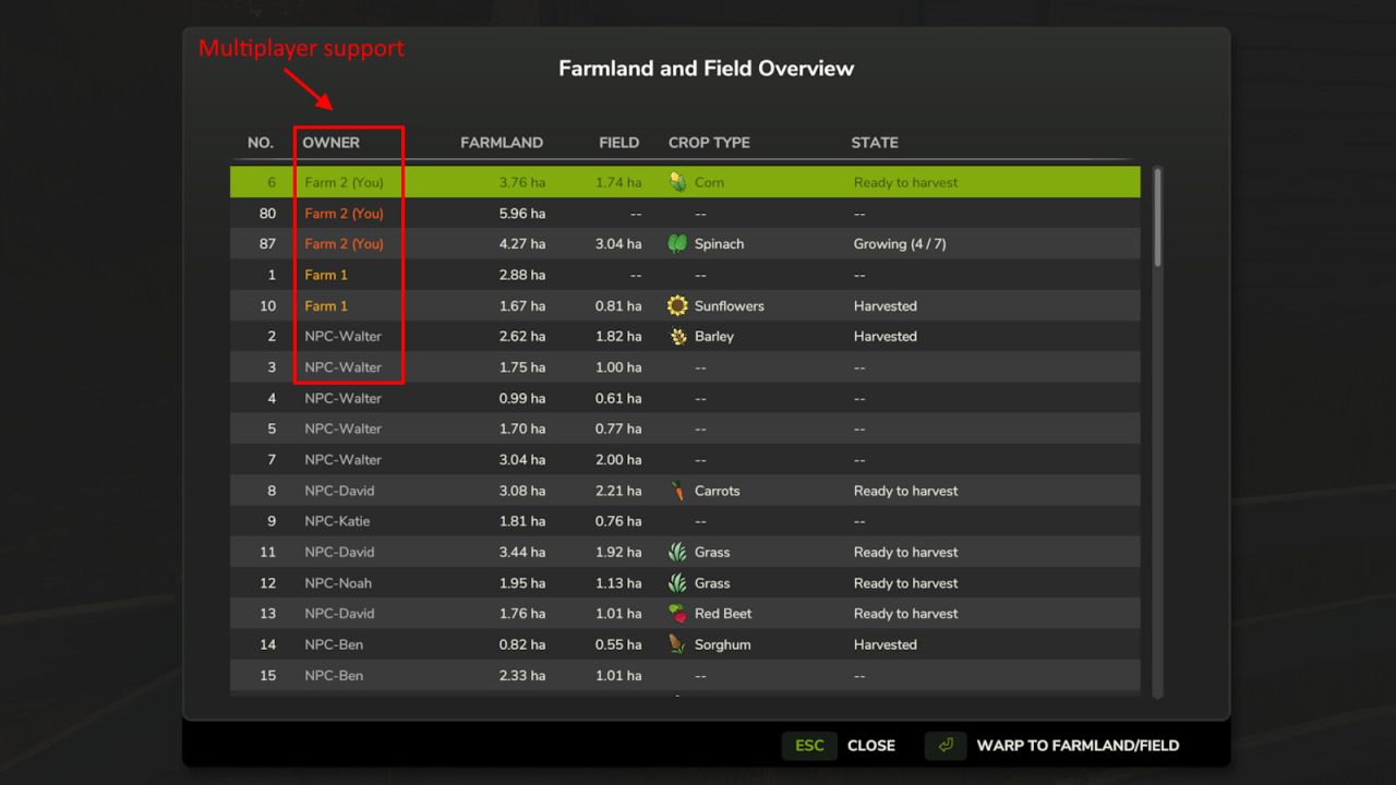 Ce module vous permet d'obtenir rapidement une vue d'ensemble de toutes les terres agricoles et des champs. Vos propres champs apparaissent en premier. Vous pouvez également vous téléporter directement vers une terre agricole ou un champ.