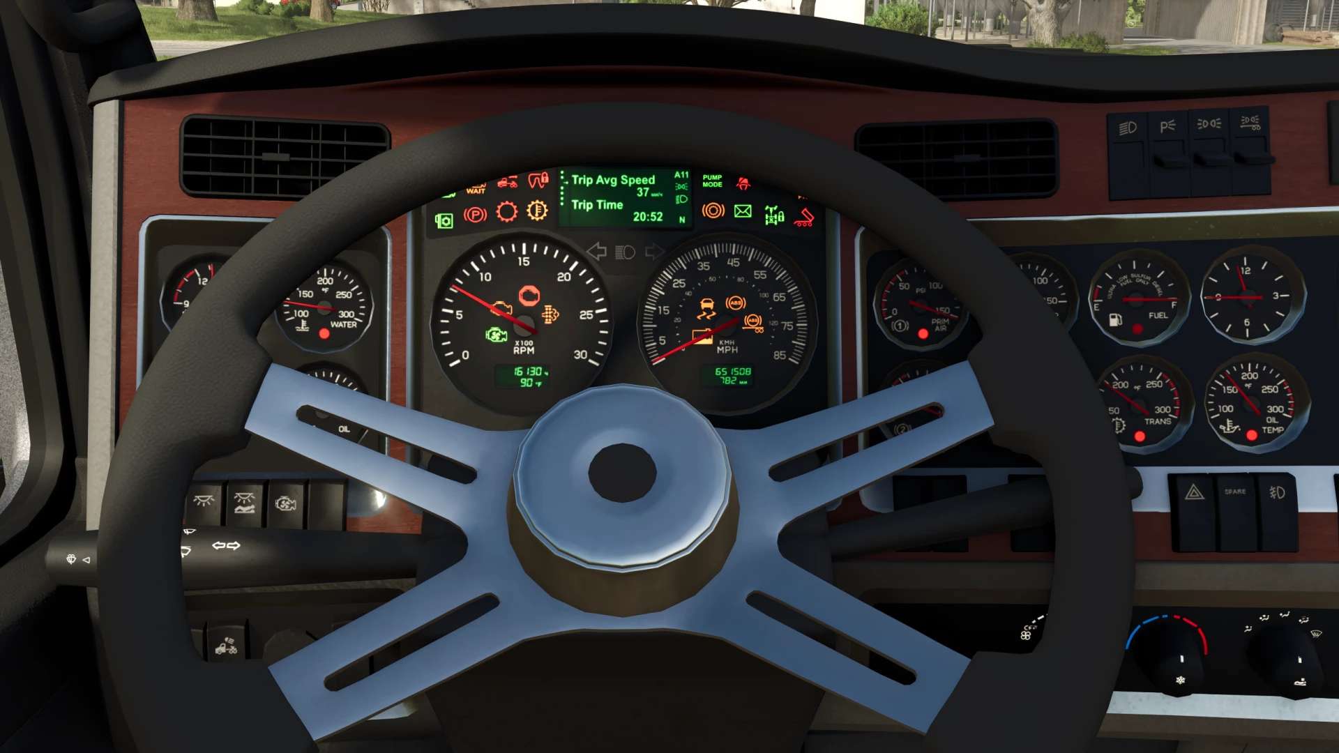– Tableau de bord, levier de vitesse, pédales et clignotants animés.