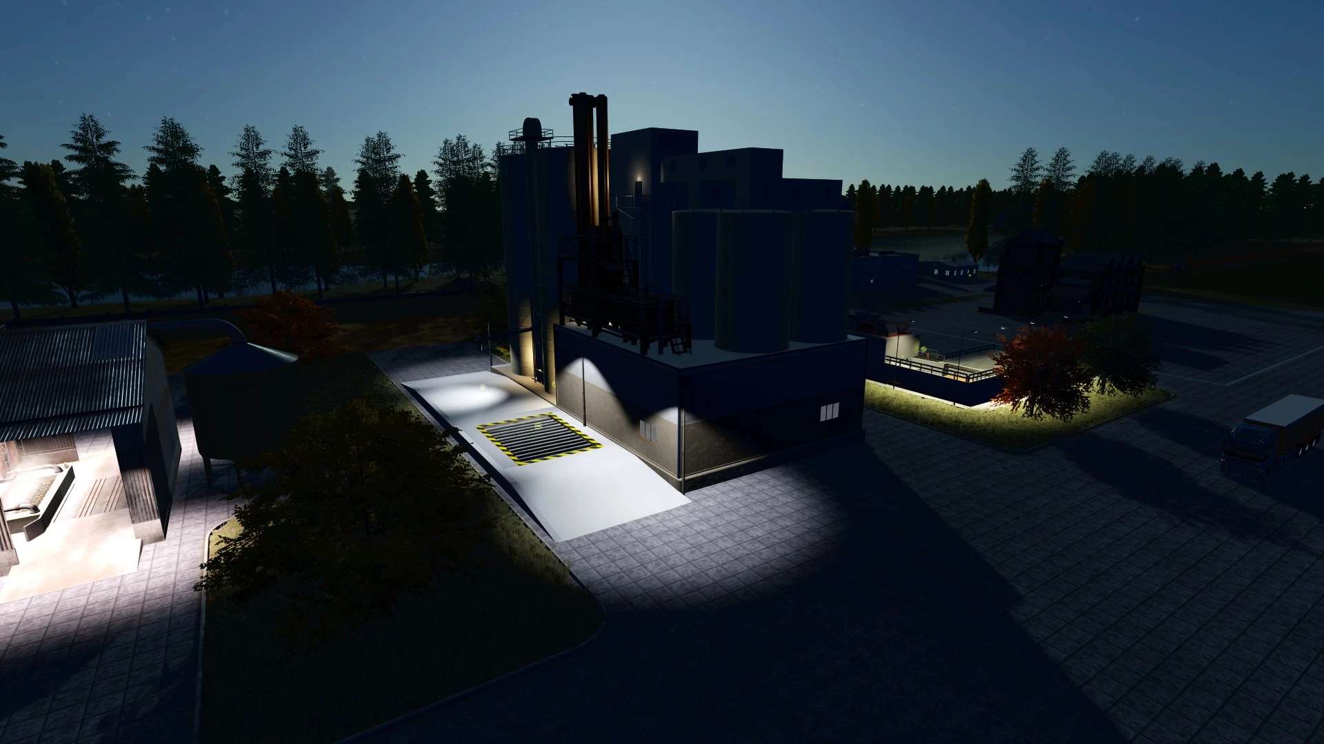 Au début, nous avons une cour, deux champs et des machines garées.