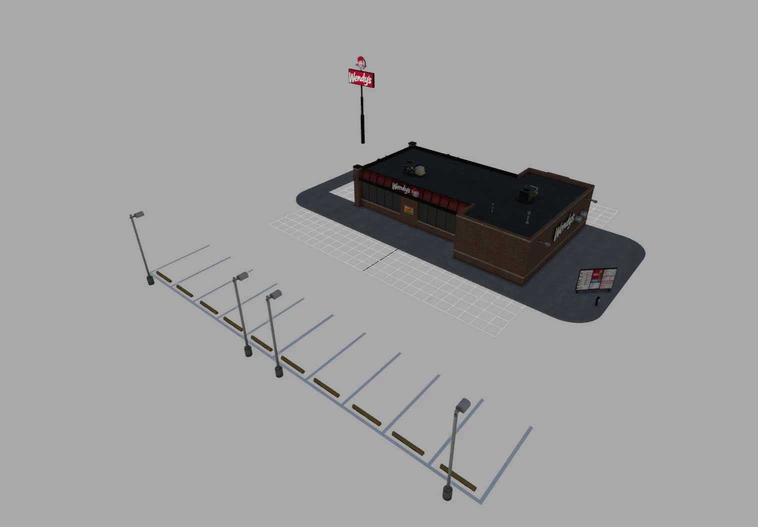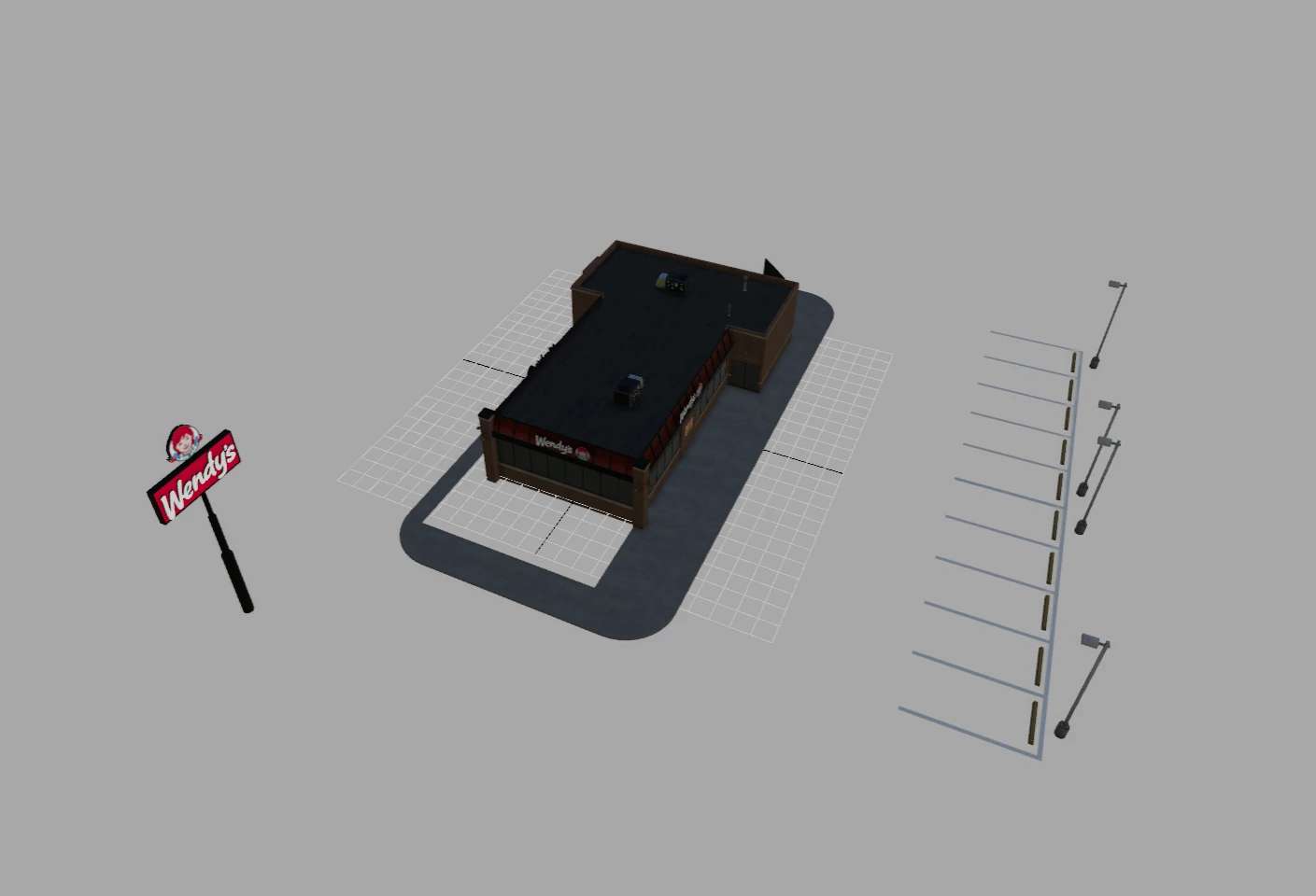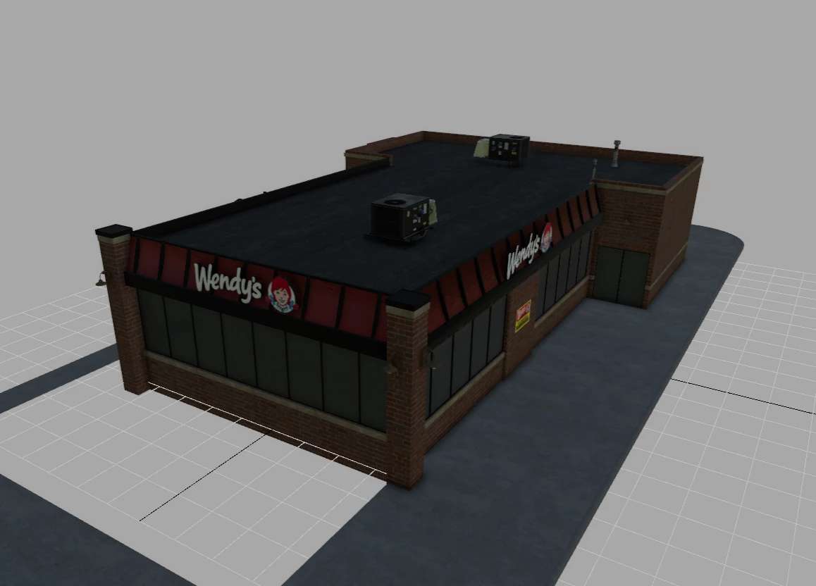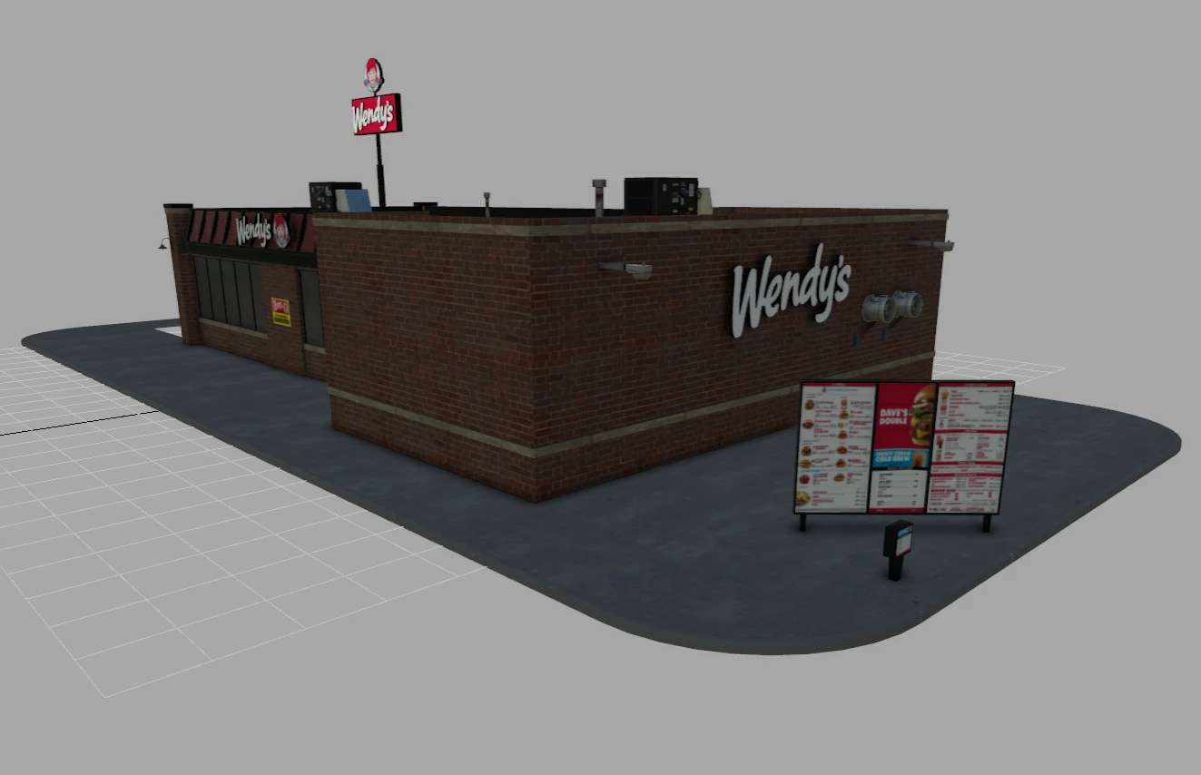 Le niveau de détail (LOD) est réglé sur 1200/1000/800 pour différents détails. Avec un shader de neige, les enseignes s'illumineront la nuit. Vous pouvez activer la rotation de l'enseigne Wendy's si vous le souhaitez.