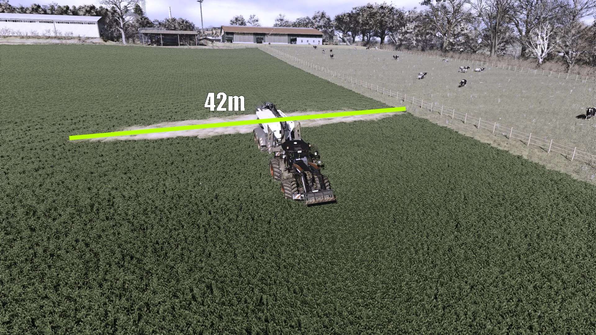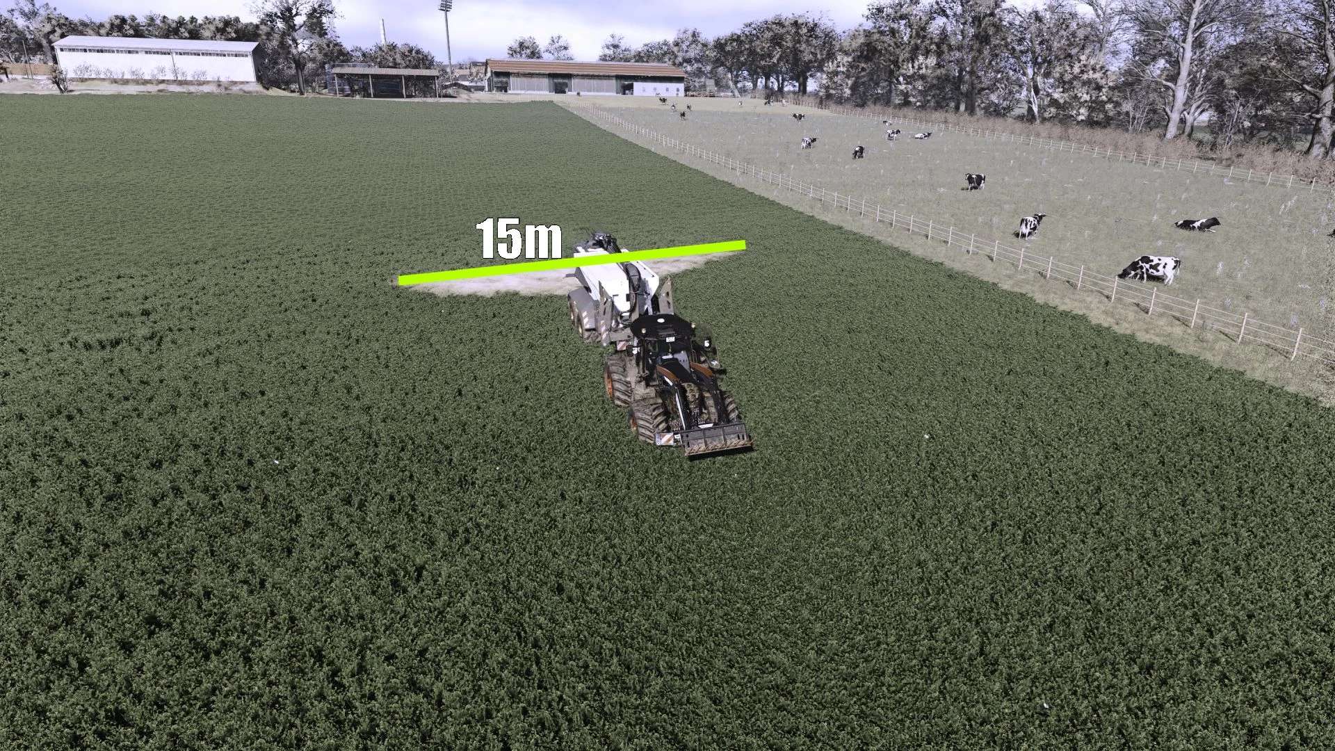 Largeur de travail : 15 m à 42 m (l’épandage de chaux a été étendu de 15 m à 42 m avec des modifications de largeur intermédiaires)